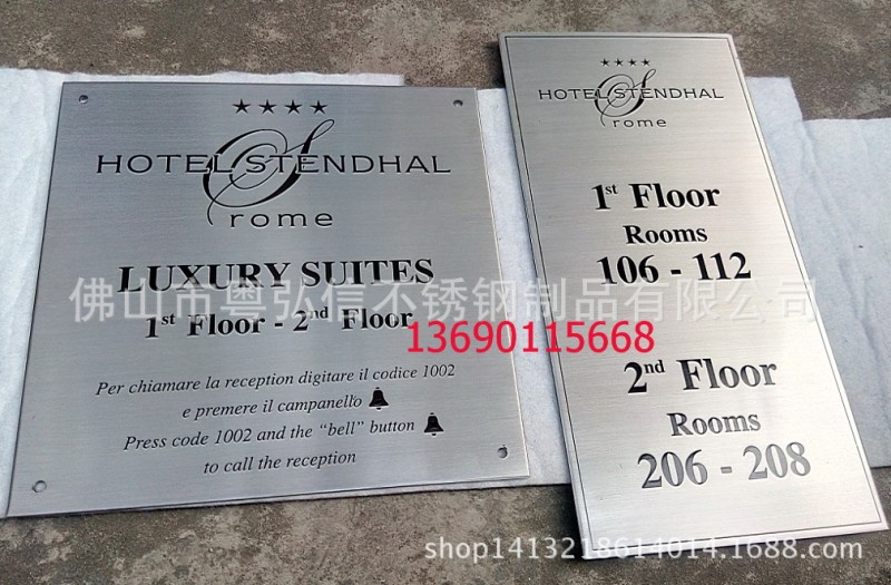 不锈钢标牌就是以不锈钢板为材料通过腐蚀、压铸或印刷等手段加工而成的广告指示牌。现阶段使用的不锈钢标牌大多数是通过腐蚀技术制作的,这样的标牌具有图案美观、线条清晰、深度合适、底面平整、色彩饱满、拉丝均匀、表面色泽一致等特点。不锈钢是一种特殊的材料,它的制作过程要比铜板、铝板难的多,但是它有良好的耐大气和淡水介质腐蚀的性能,而且通过腐蚀、抛光、拉丝后获得装饰效果十分漂亮。