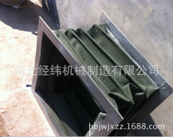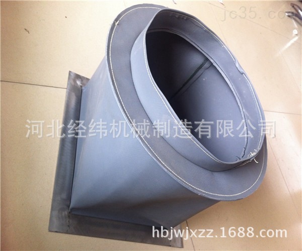 帆布软连接 采用进口帆布被覆,内置304钢丝圈为支撑骨架,具有防水、防油、防蚀、耐高温等特点。它可有效地保护丝杠、光杠、轴、立柱等零部件不受灰尘等外特的污染与破坏,也可用作风机通风使用,有伸缩性能,可自由来回摆动,也可做成方形,充作风道口软连接,同时也可用来对粉尘,液体等的输送,具有良好的耐腐蚀性。