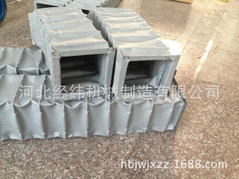 帆布软连接能够随部件做伸开或压缩运动,垂直或水平使用均可。水平使用时建议使用塑料或铝的支撑环,保持护罩内腔与丝杆之间有一定均匀的距离,延长使用寿命。拉伸长度大时可以在每个折中加上金属环,提高护罩的稳定性 考虑到使用环境因素,材质有多种选择,如:尼龙布、绝缘卷材、橡胶复合布、耐高温布,防油布、防水布、阻燃布、耐酸碱布等多种材质可供客户不同需求来量身定做。一般护套的伸长与压缩比值为10:1.5,产品形状可根据客户要求设计制造,可做成多角形,长方形,圆筒式,也可按用户要求制作比值更大或更小的软连接按要求订做帆布防护罩 帆布防尘罩 方形耐磨软连接