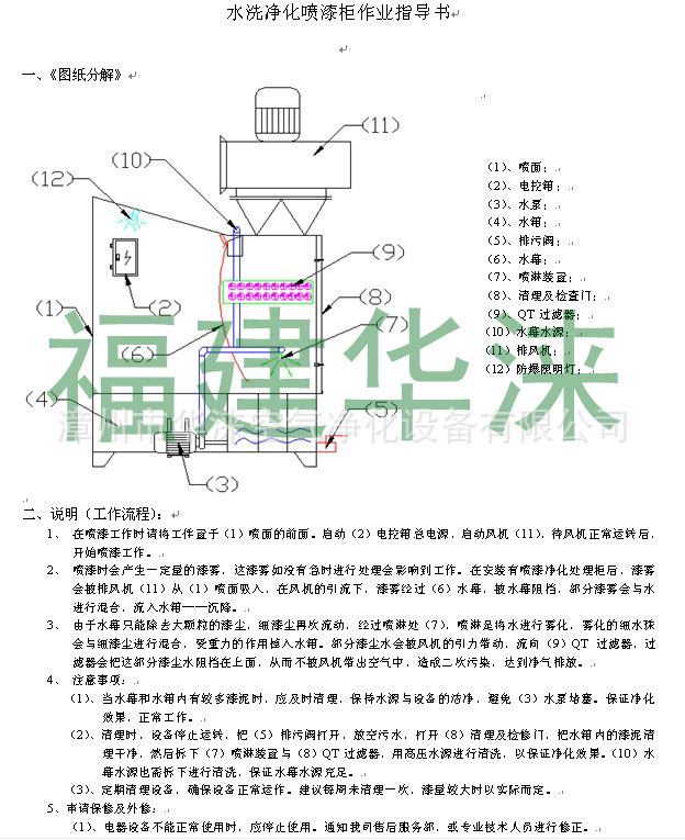 水帘喷漆室:由室体、水槽、水帘板、水循环系统、抽风过滤系统等组成,正常完成工件喷涂的同时能有效防止废漆排放而污染环境。