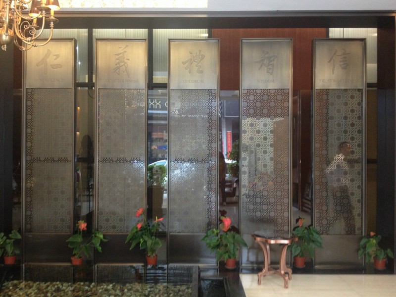 屏风一般陈设于室内的显著位置,起到分隔、美化、挡风、协调等作用。它与古典家具相互辉映,相得益彰,浑然一体,成为家居装饰不可分割的整体,而呈现出一种和谐之美、宁静之美。屏风的制作形式多种多样,主要有立式屏风、折叠式屏风等。后来出现了纯粹作为摆设的插屏,它娇小玲珑,饶有趣味。古时,王侯贵族的屏风制作非常讲究,用了云母、水晶、琉璃等材料,在镶嵌工艺上,用了玉石、珐琅、翡翠、金银等贵重物品。可谓极尽奢华。玫瑰金不锈钢屏风,室内不锈钢屏风,高档不锈钢屏风.我们御丰创展的古铜色屏风、不锈钢屏风、钛金屏风工艺说明如下:所有焊接口保证平整,拼缝口保证没有缝隙。外框刨坑折弯,花格全部焊在则面。一面不锈钢花格门焊死固定到外框架。另一面不锈钢花格门用螺丝固定做到可以折装,颜色是在做好后镀上去的,但可以保证工艺完全统一,没有色差。