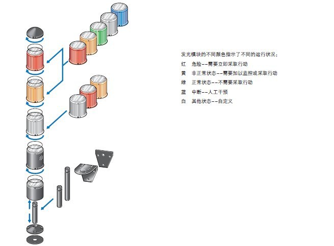 成套信号塔,由三个发光模块,一个支架和一个基座组成;包含白炽灯泡,且恒光;基座带支架和100mm垫片,