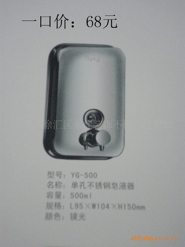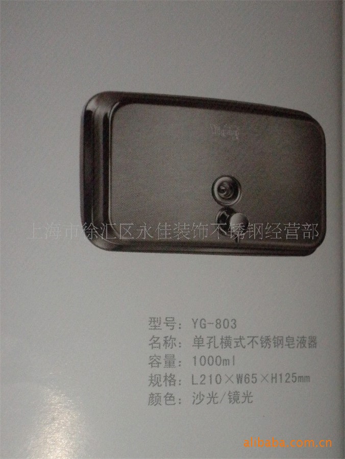【产品简介】:广泛适用于医、学校、餐馆、宾馆、写字楼等公共场所,也可用于家居厨房、卫生间、浴室等地方,可装入如洗发水、洗手液、沐浴露、洗洁精、消毒液等小用量液体。产品采用全不锈钢材质,坚固耐用,耐腐蚀性极佳,确保产品表面光泽亮丽、历久恒新。耐碰撞底片也采用不锈钢,令挂件更安全牢固。