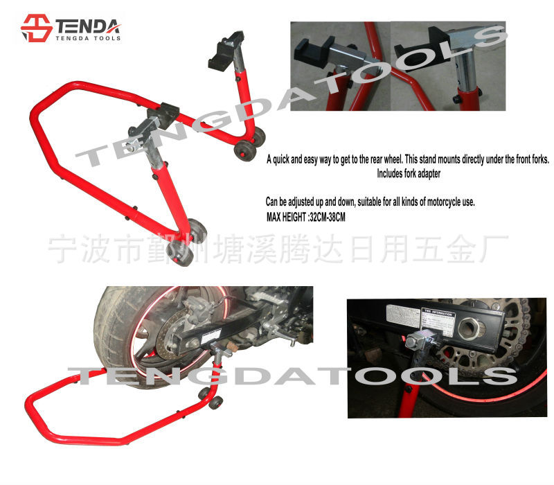 A quick and easy way to get to the rear wheel. This stand mounts directly under the front forks. Includes fork adapters. Can be adjusted up and down, suitable for all kinds of motorcycle use.MAX HEIGHT:32cm-38cm.