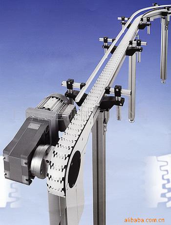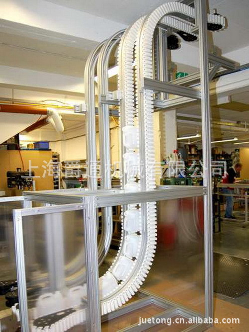 结构简单、维修方便、外形美观、运行可靠、布局灵活。平顶链宽度:61、82.5、83.8、87、88.9、114.3、152.4、190.5、254、304.8(mm);节距为38.1mm;转弯半径≥600mm。主体结构采用不锈钢或铝型材制作,工作面链板可选择不锈钢或工程塑料平顶链。广泛应用于饮料、啤酒、食品、制药、印刷、化妆品、电子等行业的生产流水线。