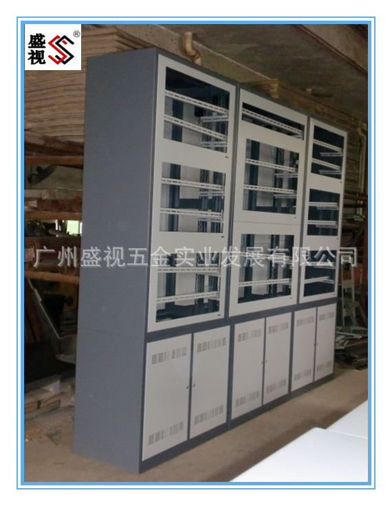 整个柜体采用的1.2毫米~2.0毫米SPCC钢板经裁剪、冲压、折弯、铆接、焊接、打磨、校形、除油、除锈、磷化、静电喷涂、高温固化、冷却等制作而成。产品可分为组装式和焊接式两种。组装式加工难度高但运输成本低,焊接式加工难度低但运输成本高。台面高度为700毫米,深底为350毫米。适合操作员在坐姿操作时双腿能伸入台面下部且不会因为碰到柜体而伤到腿;台面配有推拉式键盘抽屉,预留有鼠标线孔。有利于操作台面的井然有序;每联柜体后上部配有交流散热风扇一套(风扇、风扇罩、1米电源线,已组装好),后门(可锁)预留有散热通风孔。有利于柜体内部产生循环风而达到散热功能,后门便于检修柜体内的设备;柜体下部(底板后部与下部)预留有进出线孔位便于走线;柜体下部配有可调节层板一件,转动前门(可锁)。层板便于放置卧式主机或其它设备,前门便于打开操作设备;整个柜体为一把钥匙打开;柜体上部(平台式除外)首层为倾斜面,与台面夹角为105度,从第二层起与台面夹角为90度。有利于操作员在长时间目视画面时眼睛不疲劳;柜体上部(平台式除外)配有可调节显示器层板一件,可拆卸活动前面板一件。前面板有利于更换显示器时不用更换柜体而只更换面板;台面与柜体为组合式(平台式除外)更有利于运输;颜色任意搭配(通常为电脑灰),使整个柜体实用美观。