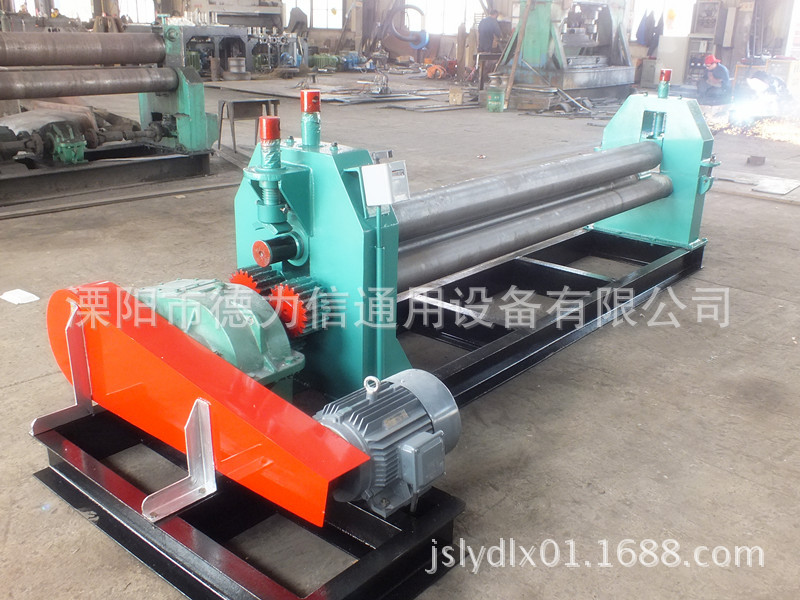 2、本机为对称上调三辊式,两支下辊固定在支架上,为主动辊,上辊为可升降调节的被动辊,以适应工件卷制工艺的需要。