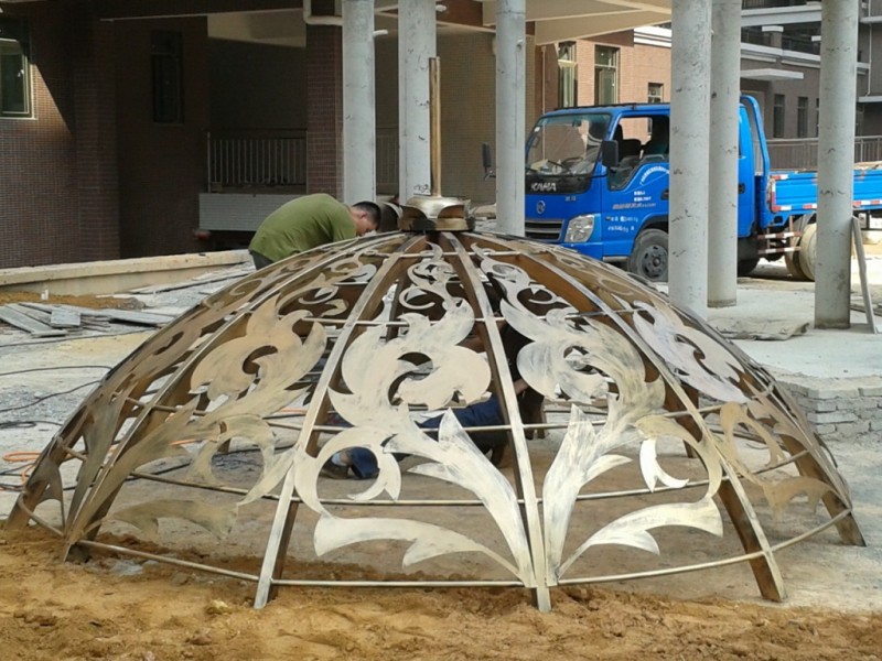 中欧式景观凉亭、铁艺穹顶主要适用于园林景观、广场·公园美化、企业标志,高档小区图标等等,钢板都是加厚坚固的,一些花型要手工加工才能完成,生产时间比较慢,一般在30天左右,穹顶采用铁形方扁管弯转成形焊接·,花型组合等拼接而成,可以整体运输。也可以分体组合降低运输费用,由于客户要求的花型、尺寸不一样、所以都是按图纸订货生产,我们热忱欢迎您来图来样,或亲临本厂指导交流,参观......!