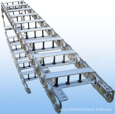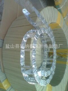 - 钢铝拖链的材质:冷轧钢和不锈钢。拖链的型号、拖链的总宽、拖链的长、支撑板的型式、支撑板内置孔的大小、拖链的弯曲半径