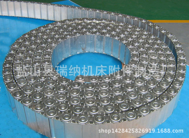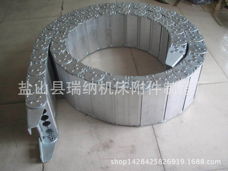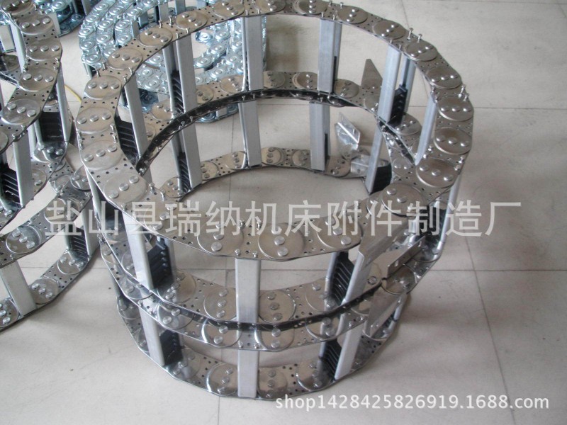 - 钢铝拖链的材质:冷轧钢和不锈钢。拖链的型号、拖链的总宽、拖链的长、支撑板的型式、支撑板内置孔的大小、拖链的弯曲半径