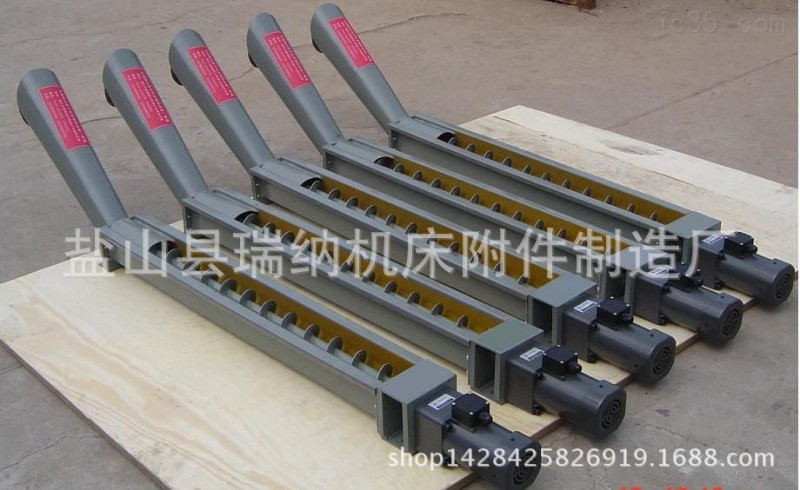 本装置通过减速机驱动带有螺旋叶的旋转轴推动物料向前(向后),集中在出料口,落入指定位置,该机结构紧凑,占用空间小,安装使用方便,传动环节少,故障率极低,尤其适用于排屑空间狭小,其他排屑形式不易安装的机床。