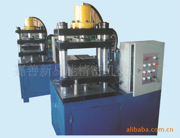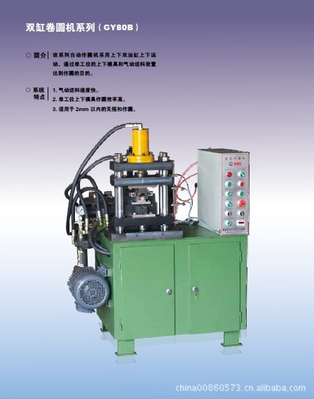 落料落好的平板料片放入料斗,通过气缸自动送料,采用冲压级进送料原理,自动送料,自动预弯,自动打U,自动卷圆,3个工位同时动作,一次作圆成型,达到冲床上三个工位,三台机器的生产效果。